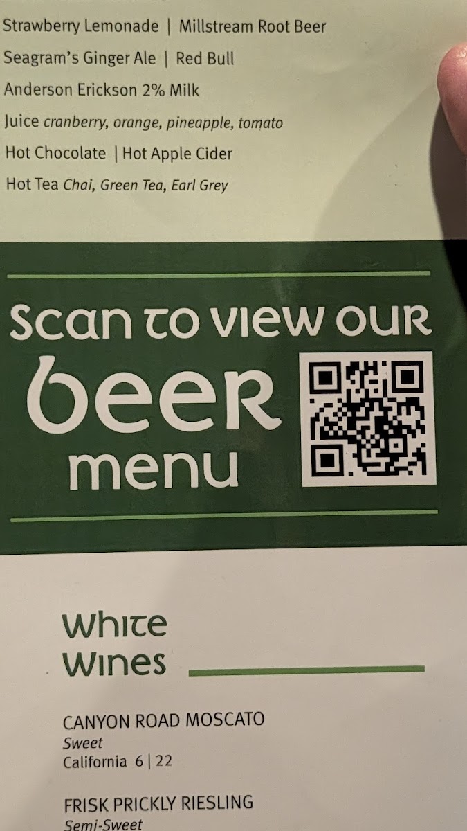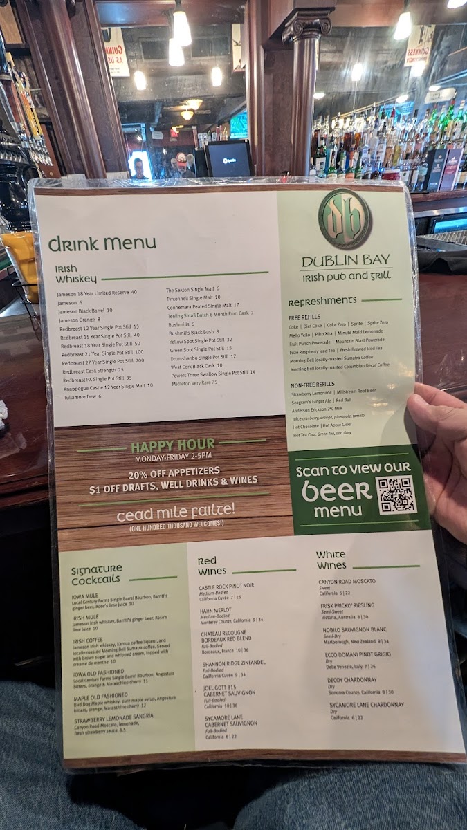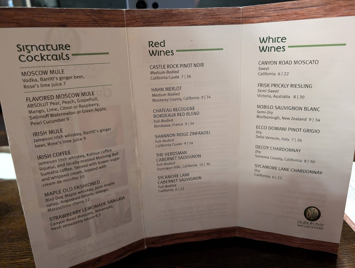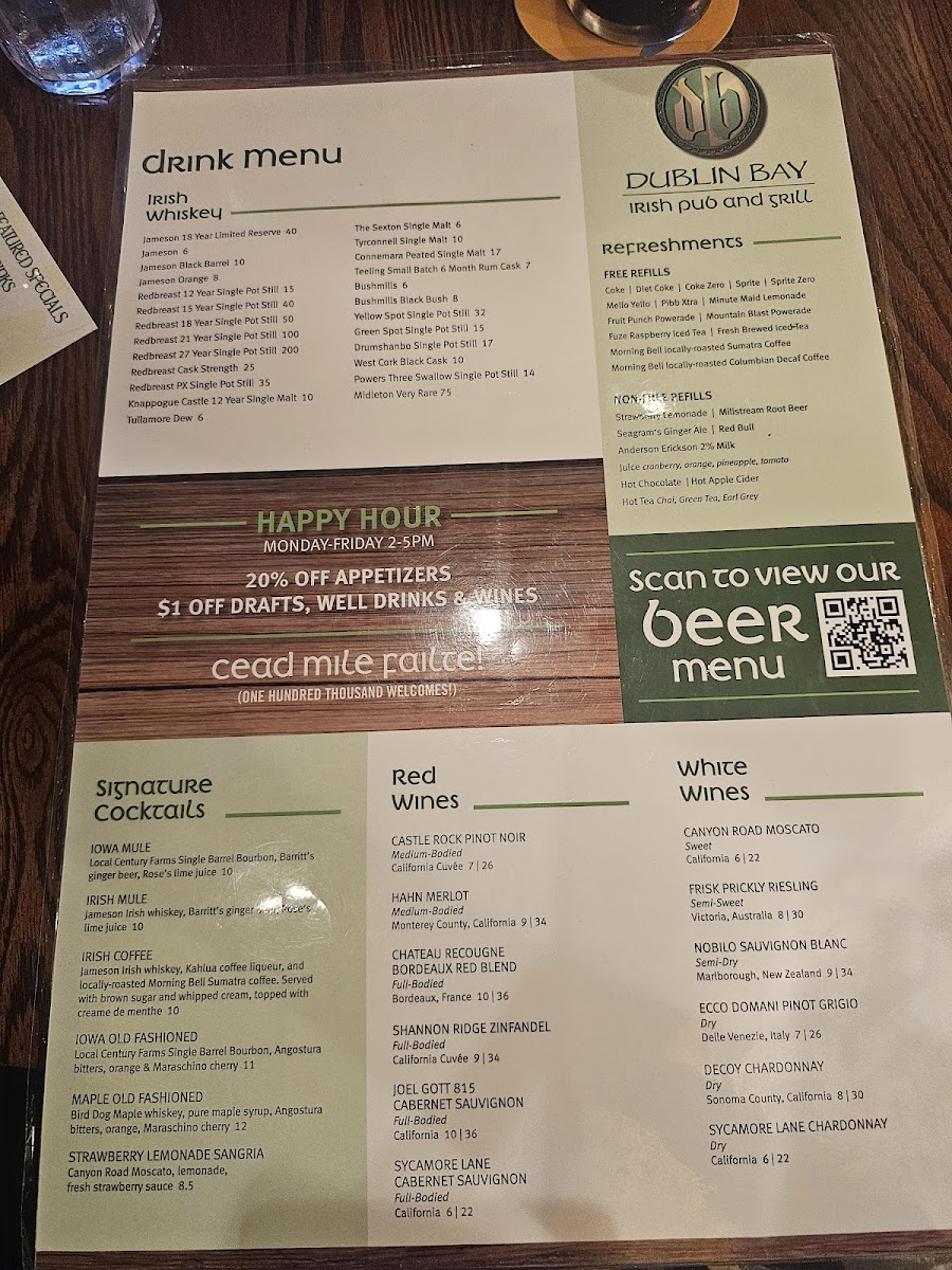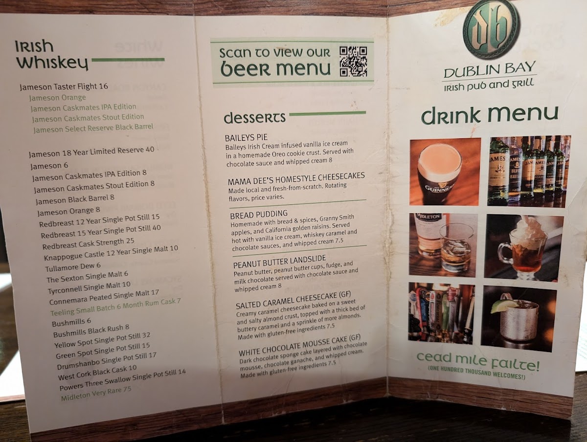 Jameson Irish whiskey, Kahlua coffee liqueur, and locally-roasted Morning Bell Sumatra coffee. Served with brown sugar and whipped cream, topped with creame de menthe